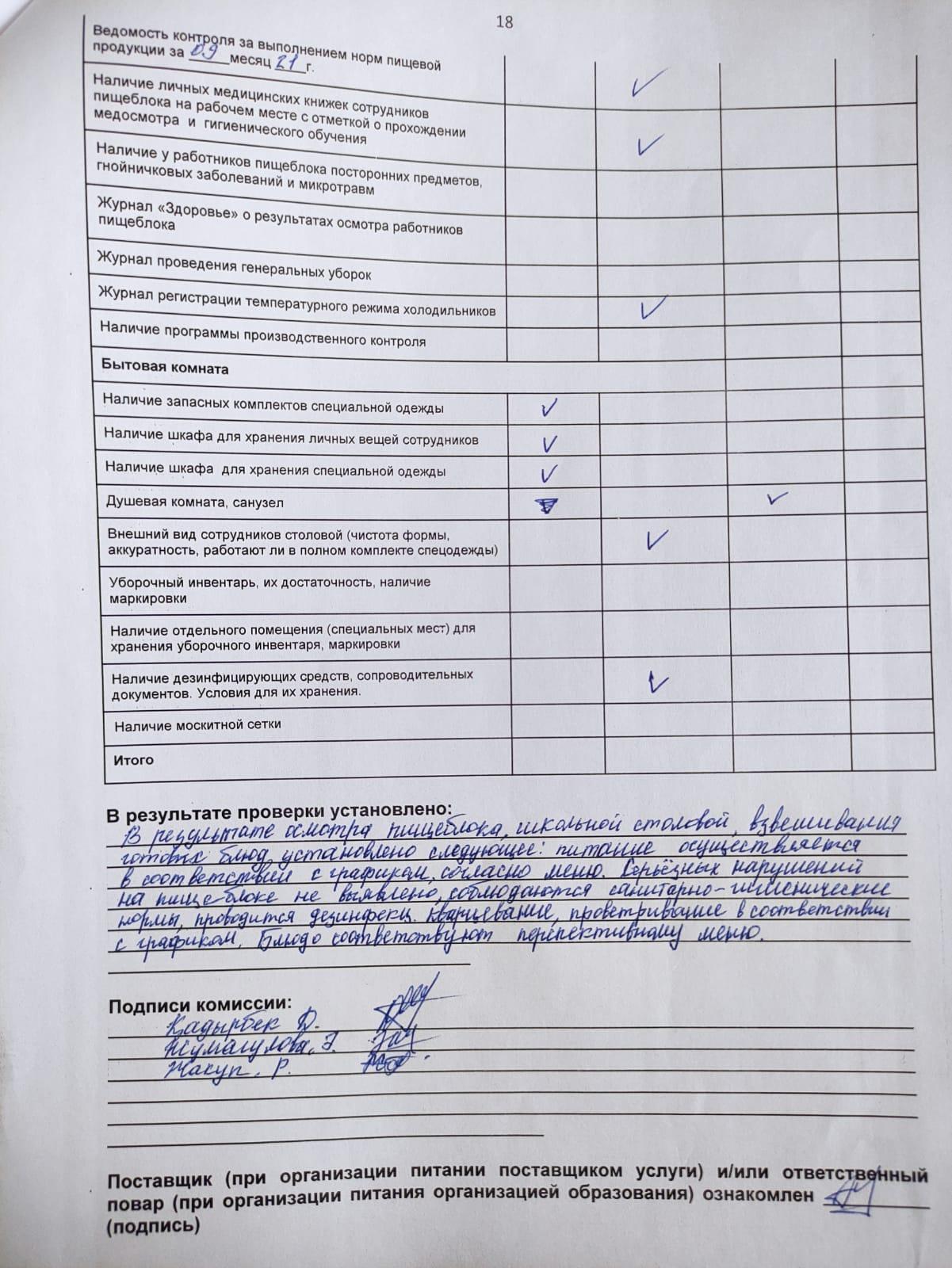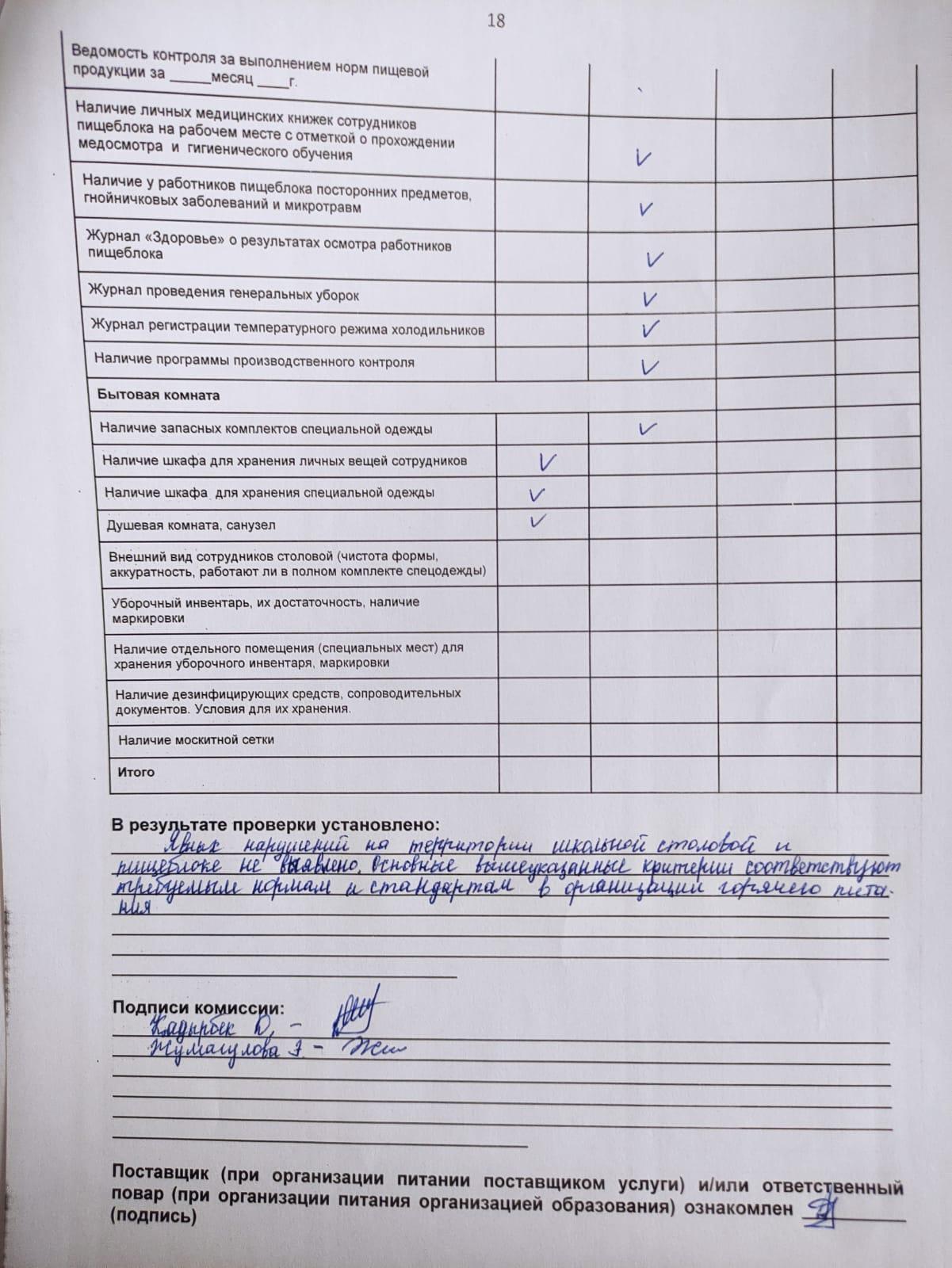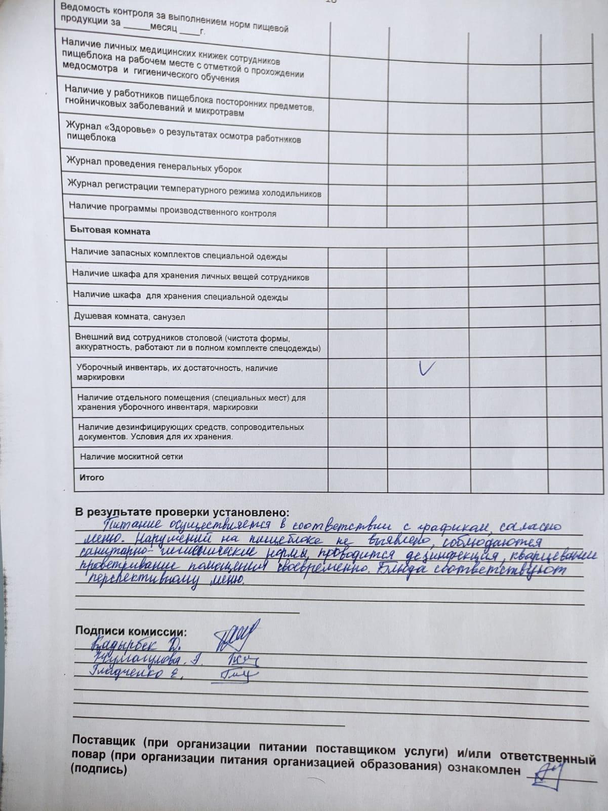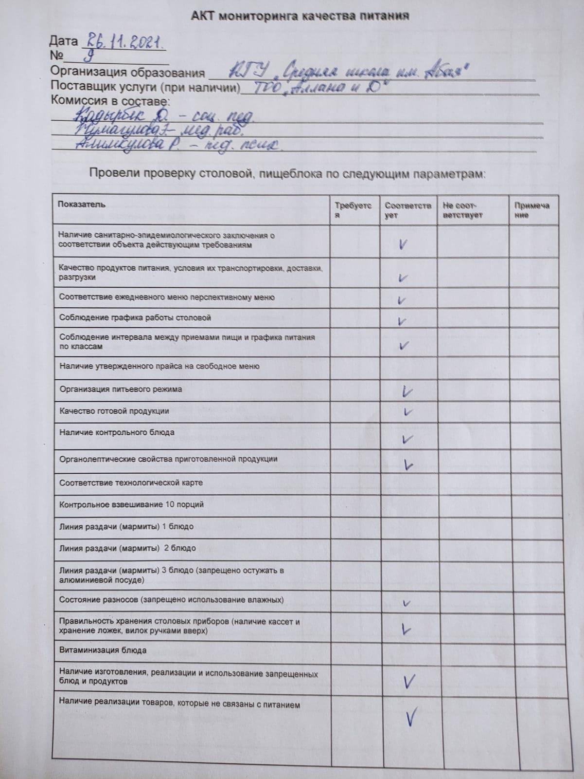 В целях контроля качества питания еженедельно проверку осуществляет бракеражная комиссия КГУ "Средняя школа имени Абая"